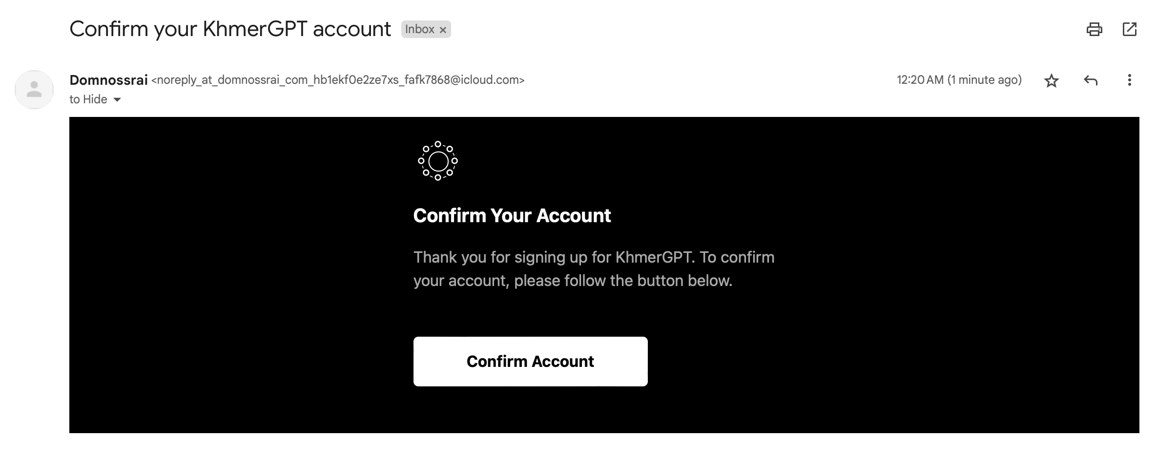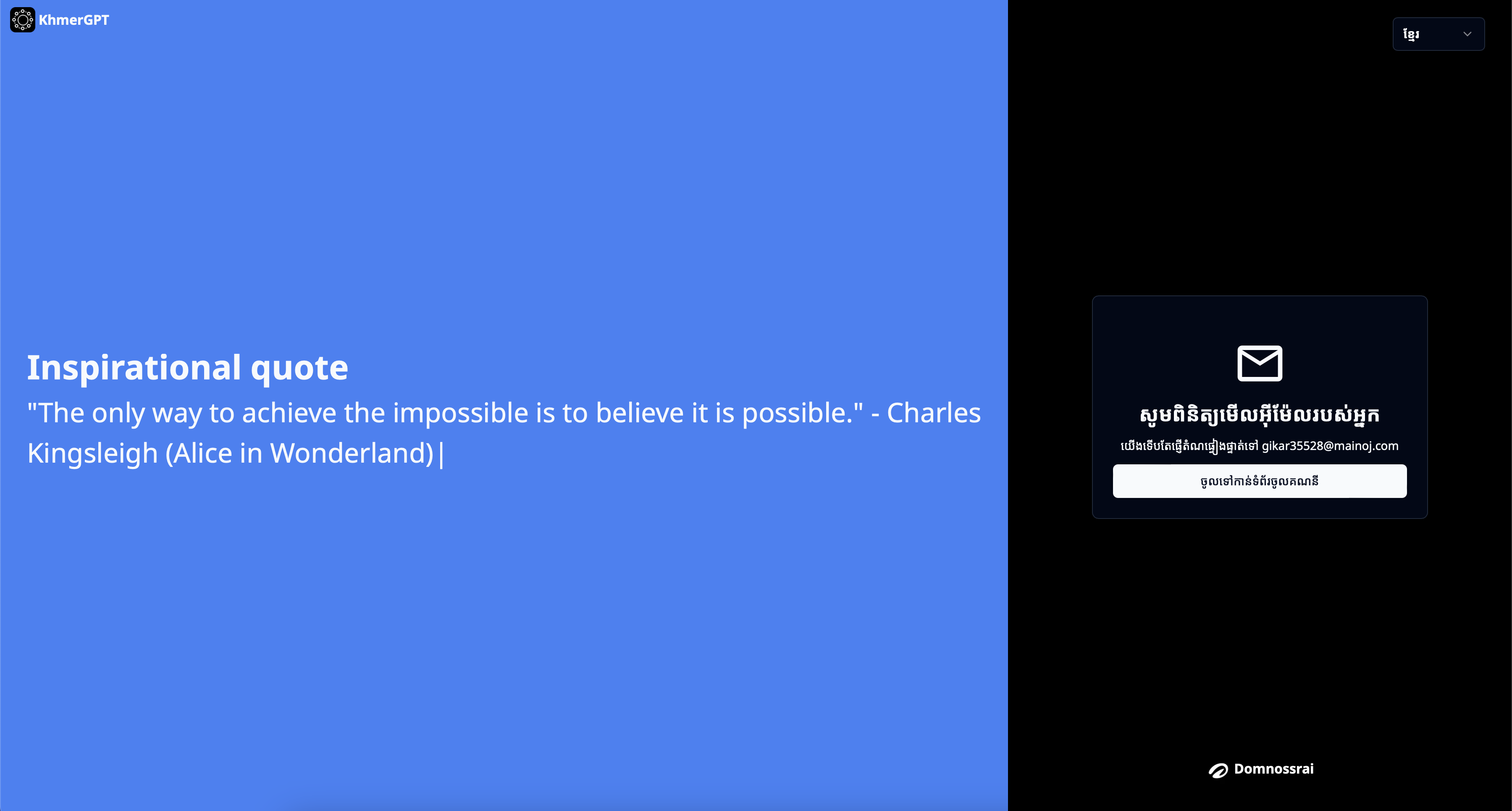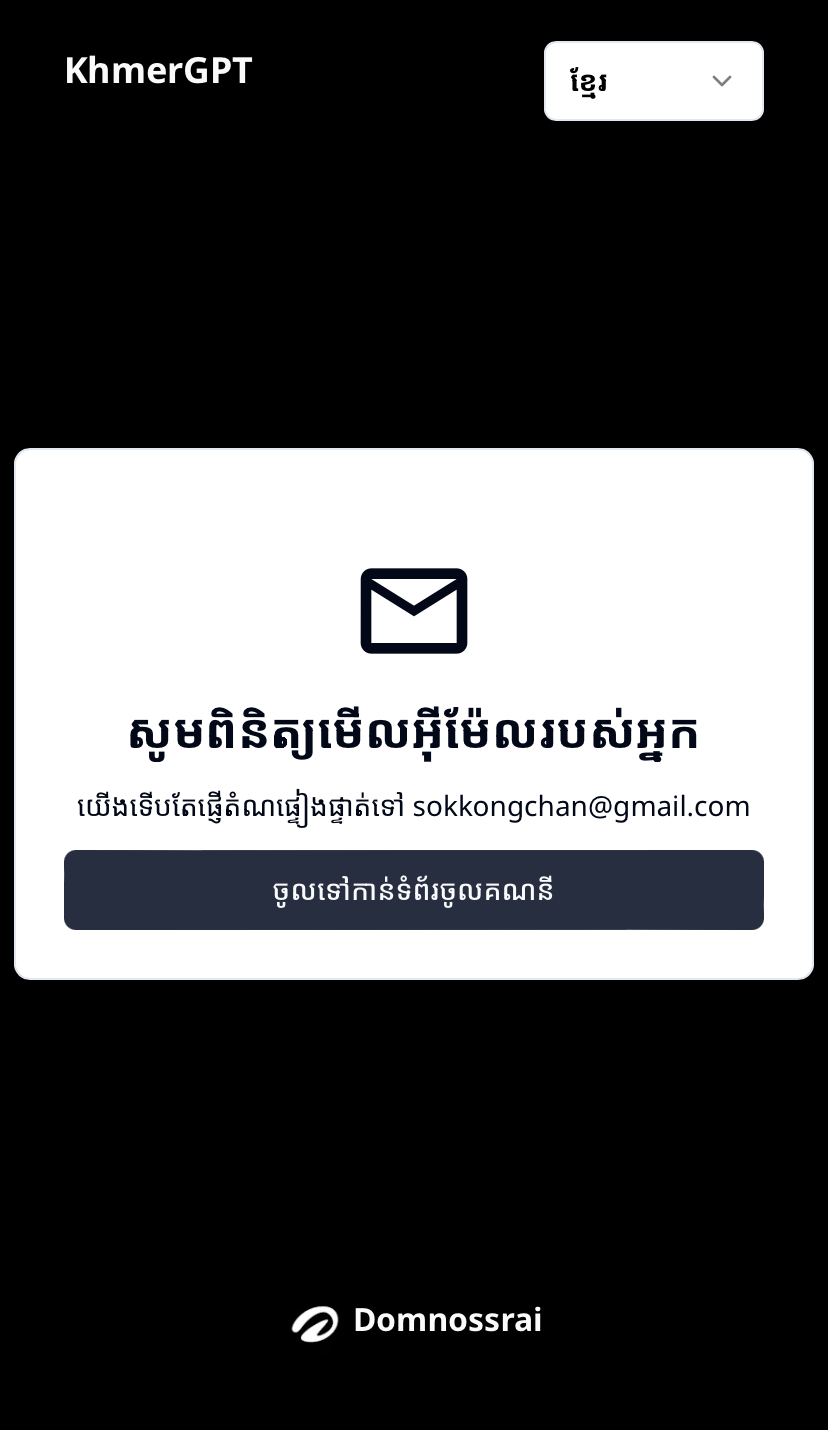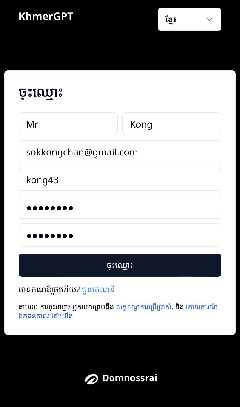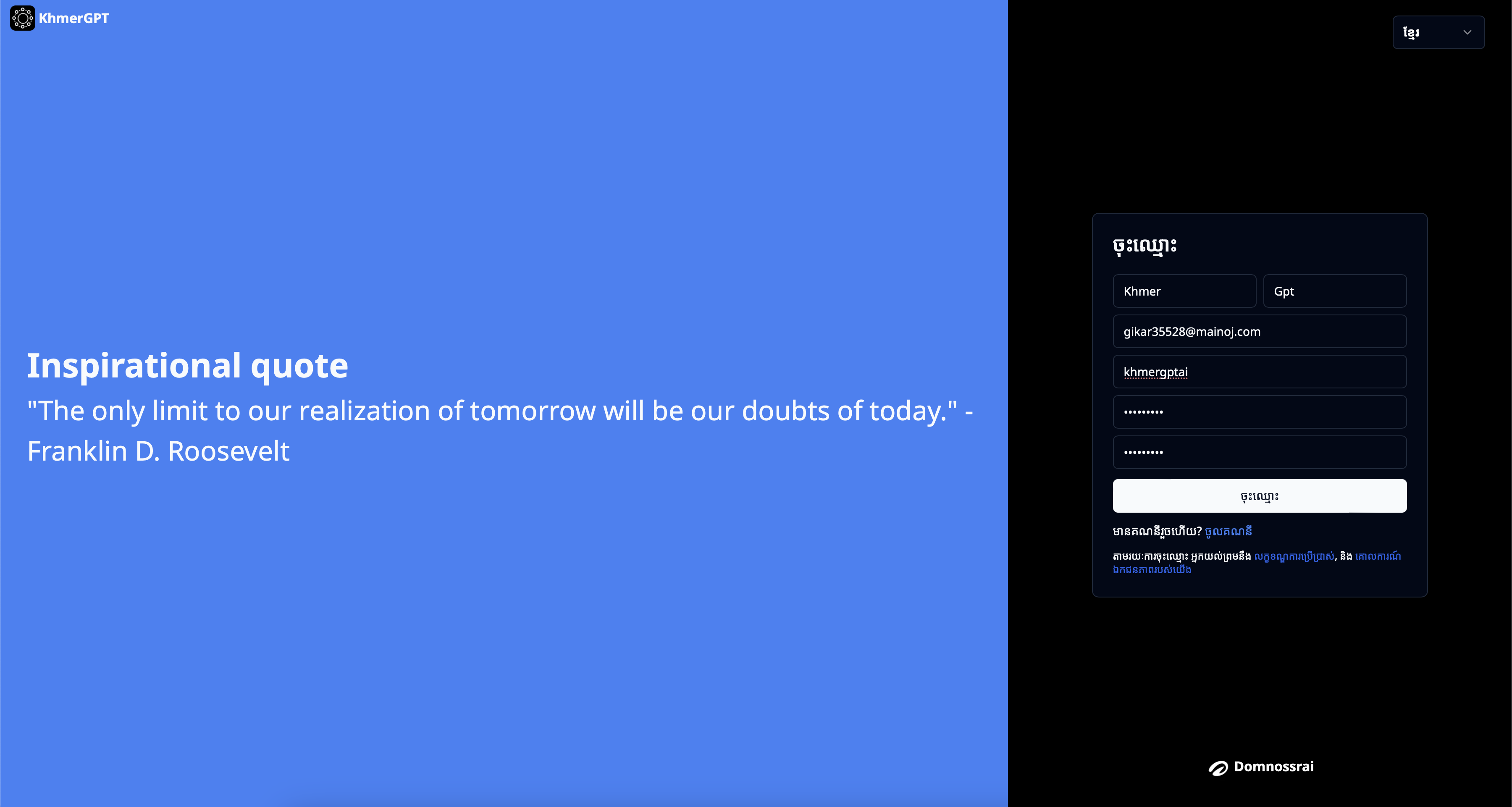 ឯកសារនេះពន្យល់ពីរបៀបចុះឈ្មោះគណនីដើម្បីចូលប្រើ Domnossrai ។ នៅពេលដែលអ្នកបានចុះឈ្មោះរួចរាល់ អ្នកនឹងអាចចូលទៅកាន់ប្រើប្រាស់ ChatBot AI របស់យើង។